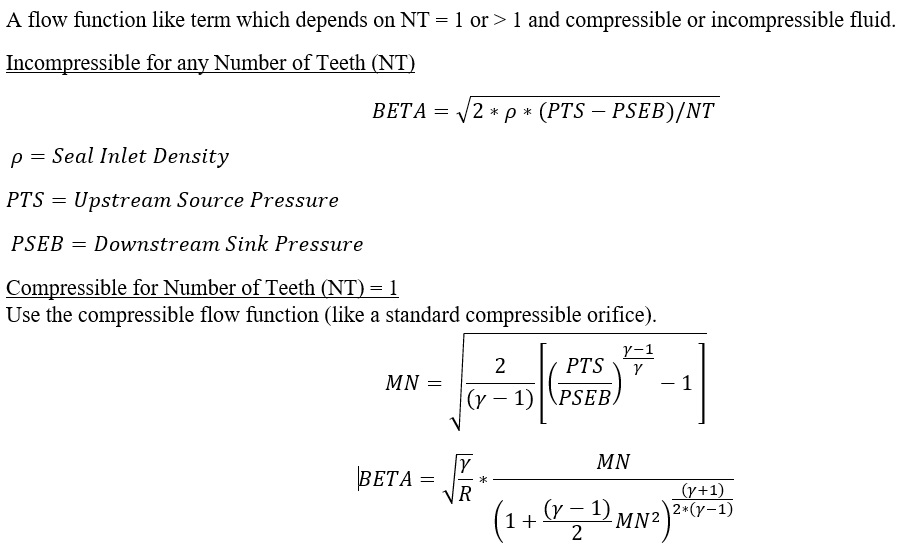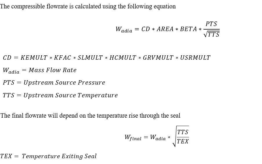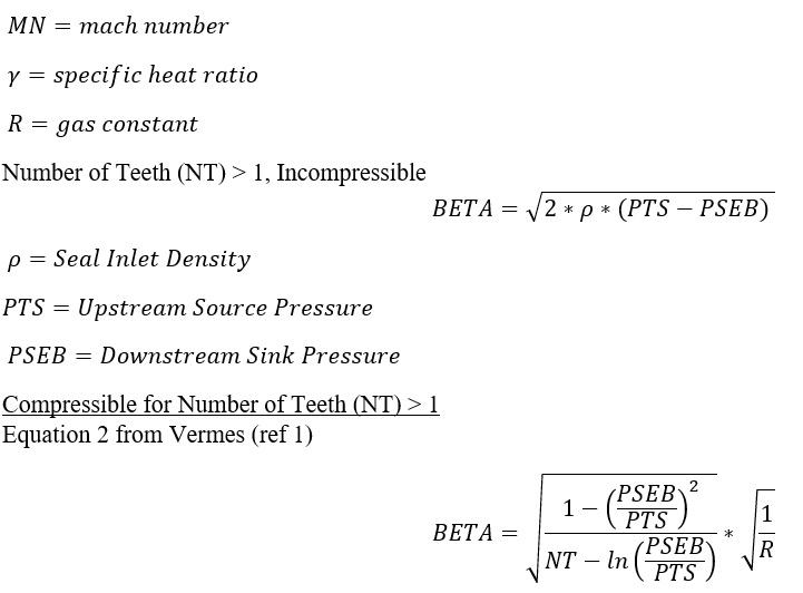 For compressible gasses, the calculated seal mass flow is compared to the mass flow for choked flow through the last tooth. If the choked flow through the last tooth is less than the calculated seal mass flow, the choked flow is used. The equations for the choked flow calculation are: