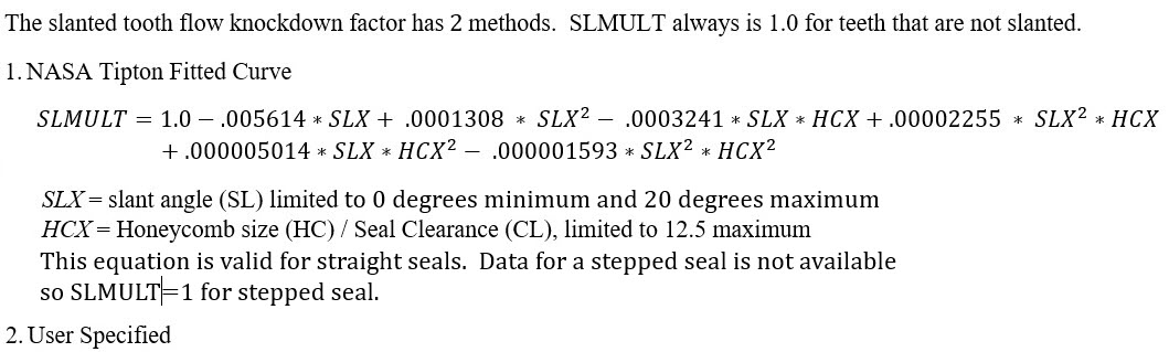 24 | Slant Flow Multiplier (SLMULT) | Slanted Teeth Flow Knockdown Factor is a multiplier that is applied to straight-tooth leakage flow to calculate the corrected leakage flow with slanted teeth. Typical values are from 0.85 to 1.1. Three-dimension flows in seal pockets are complex, and it is difficult to explain why the factor is sometimes less than one and sometimes greater. | |||||||||||||||||||||||||||||||||||||||||||||||||||||||||||||||||||||||||||||||||||||||||||||||||||||||||||||||||||||||||||||||||||||||||||||||||||||||||
