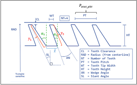 25 | Swirl Carryover Factor per Tooth (ETATOOTH) | Swirl Carryover per Tooth is the fraction of tangential fluid velocity (relative to the stator) that passes each tooth and enters the next pocket. This is a calibration parameter that helps to match the correct swirl and windage heating. It is especially useful for stepped honeycomb seals where the air passes over the tooth and immediately impinges on the honeycomb step. | |||||||||||||||||||||||||||||||||||||||||||||||||||||||||||||||||||||||||||||||||||||||||||||||||||||||||||||||||||||||||||||||||||||||||||||||||||||||||