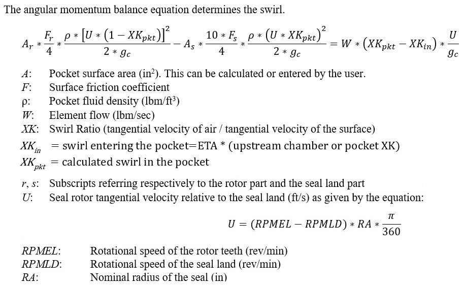Generally, ASR=0 and the rotor friction area is calculated from other geometric inputs such as tooth height, spacing, wedge angle, slant angle, etc. If you enter a non-zero value, your input will override the calculated area. This is especially useful for stepped seals, since the current Vermes Seal element does not have a step height input. However, it could be better to ignore the step height and rely on ETATOOTH – please see above. Solver units are sq.in. | |||||||||||||||||||||||||||||||||||||||||||||||||||||||||||||||||||||||||||||||||||||||||||||||||||||||||||||||||||||||||||||||||||||||||||||||||||||||||