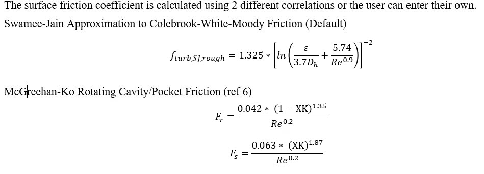 0: Swamee-Jain Approximation to Colebrook-White-Moody Friction (Default) 1: MacGreehan-Ko Rotating Cavity/Pocket Friction 5: Sultanian -1: User supplies FRICF_STATOR, either constant value or calculated using controllers. See FRICF_STATOR details below. |