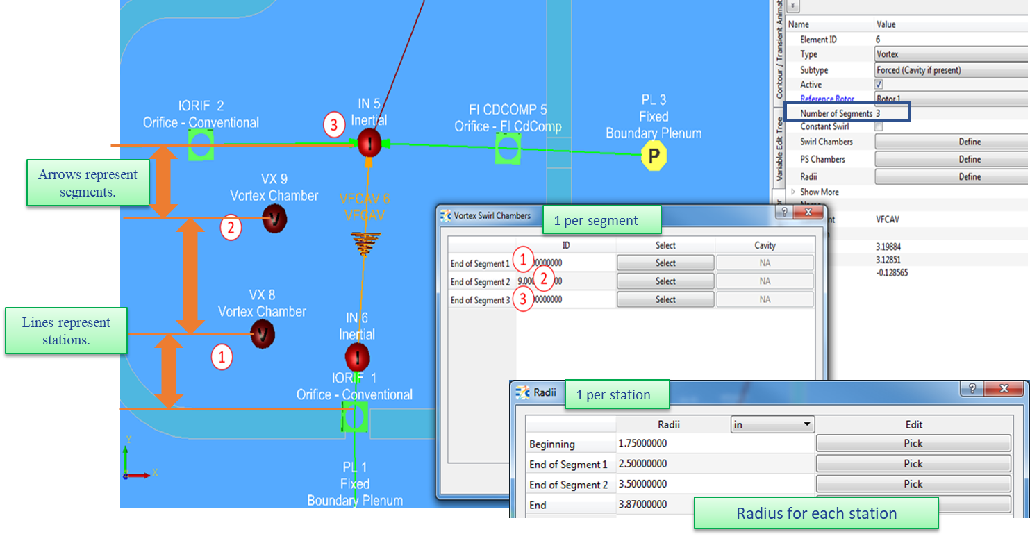 In the Figure 1.1 Vortex Element setup, the forced vortex (No: 6) is split into three segments. The Swirl chambers are required for each segments & the radius need to be specified for each station. The Select option in vortex swirl chambers panel allows users to select chambers from the GUI. The Pick option in Radii Panel allows users to pick chambers & the corresponding chamber radius (Y Location) are updated automatically for the station radius. These options are beneficial when the model is created in association with IGES & chambers representing real locations on the geometry. This Model is available under section Exercise: Simple Cavity.
