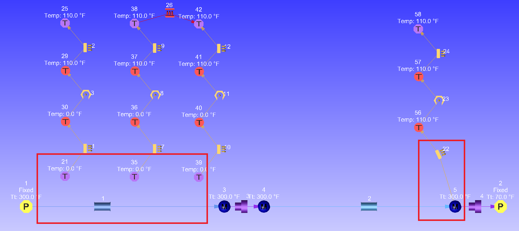 In the above example, the Boundary Temperature Nodes are associated with the Tube element and each Convector Resistor is linked to one of the tube segments. The Convector Resistor is coupled with a Momentum Chamber.