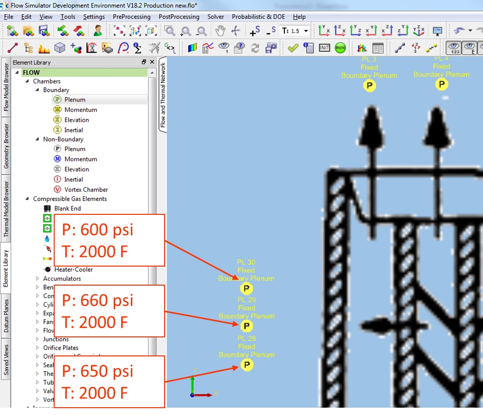 2. Set the two Plenums at the tip to pressure of 650 Psi and temperature of 2000 F