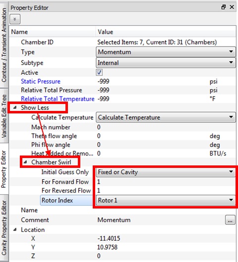 • Due to the rotating nature of the blade, the user will have to account for the pressure and temperature rise from the pumping created by the rotation, by enabling Chamber Swirl and specifying a Rotor Index for the elements.