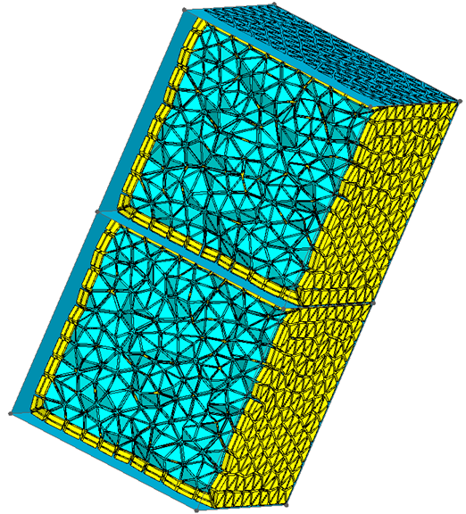 This mesh generator, based on the MeshGems-Hybrid module of Distene, is a mixed mesh elements generator in Flux (it creates hexahedra, prisms, pyramids, or tetrahedra). It allows to mesh the skin depth with extruded elements (prisms, hexahedra) and relax the mesh in the remaining volume. It is based on the initial surface mesh of the volume without modifying it.This mesh generator can be assigned to volumes only. It is robust, simple and fast to use, even on complex shapes.