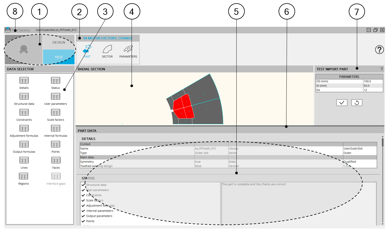 | 1 | Part Factory has two main environments: DESIGN and TEST. When the TEST is selected, it appears in blue color and it is possible to test the behavior of the considered part. |