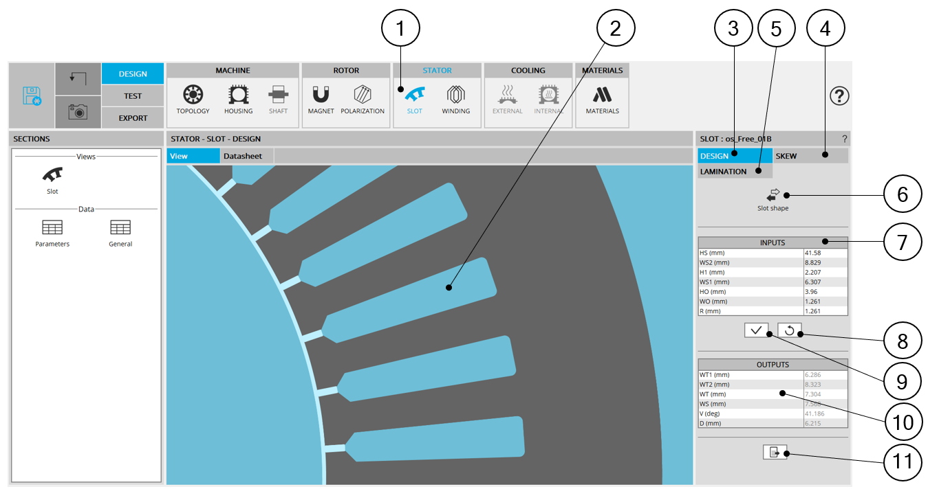 | 4 | SKEW tab indicates the tools to define the slot skew angle |