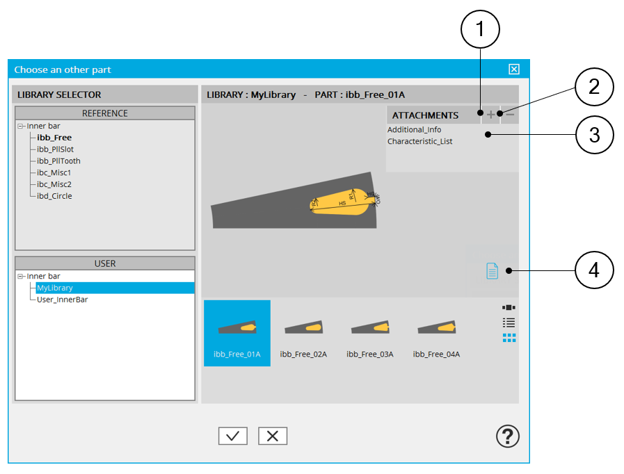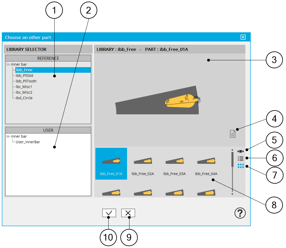 Visualization of reference libraries i.e. the libraries of bar topologies provided with the software. Select them to view their content and choose the bar among their content. See “Part Library” application for more information. |