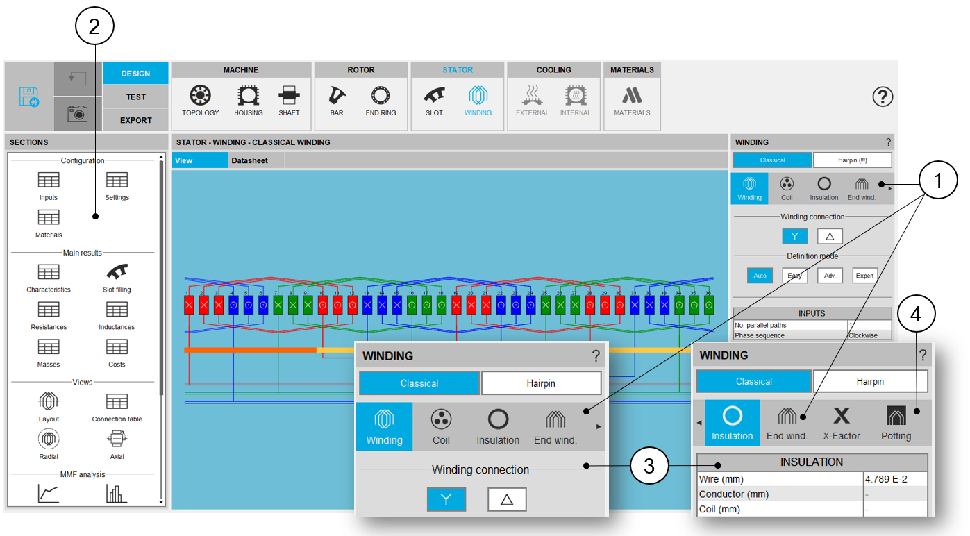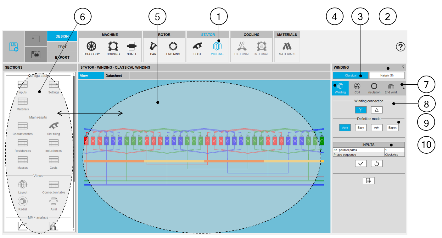 | 7 | A section scrolling bar allows choosing the section in which user inputs are defined.Scrolling selection bar where Winding architecture, Coil, Insulation, End-winding, X-Factor and Potting sections can be selected |