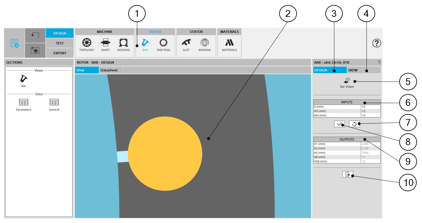 | 2 | Visualization of the motor radial view with the bar topology and dimensions. |