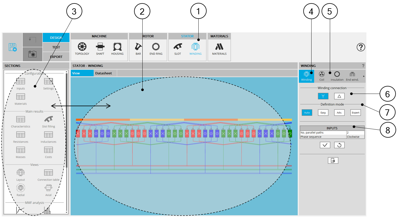 1 Selection bar where Winding, Coil, End-winding and X-Factor sections can be selected