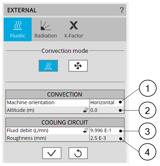 | 6 | Roughness: The roughness of the cooling circuit pipe is only taken into account to compute the regular pressure losses in the cooling circuit and does not affect the computation of the temperatures. |