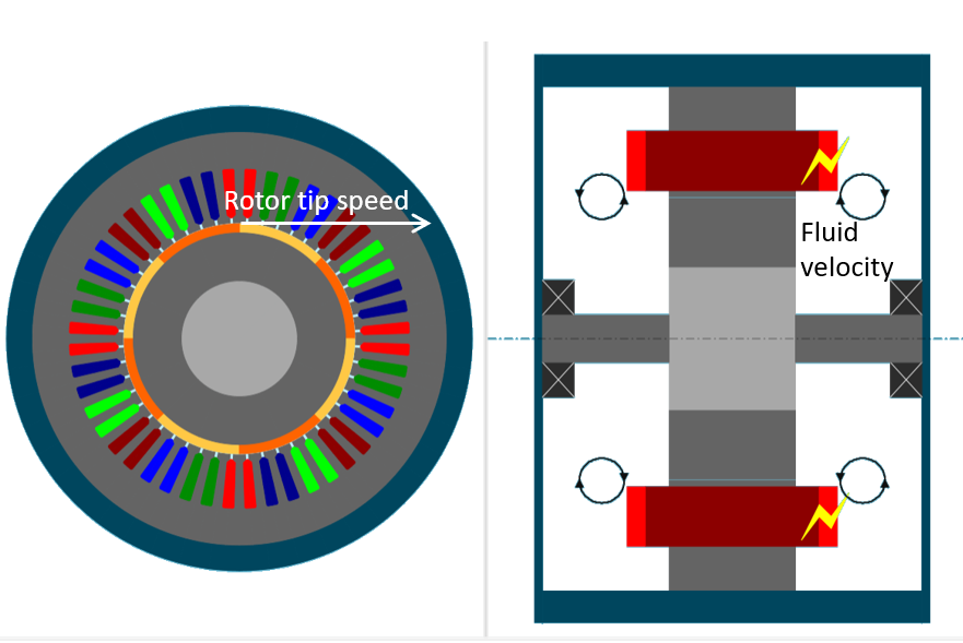 - In both input modes « Tip speed ratio » and « Constant fluid speed », the fluid speed is applied to classical correlations depending on the nature of the sub region (end winding, frame, rotor part…).