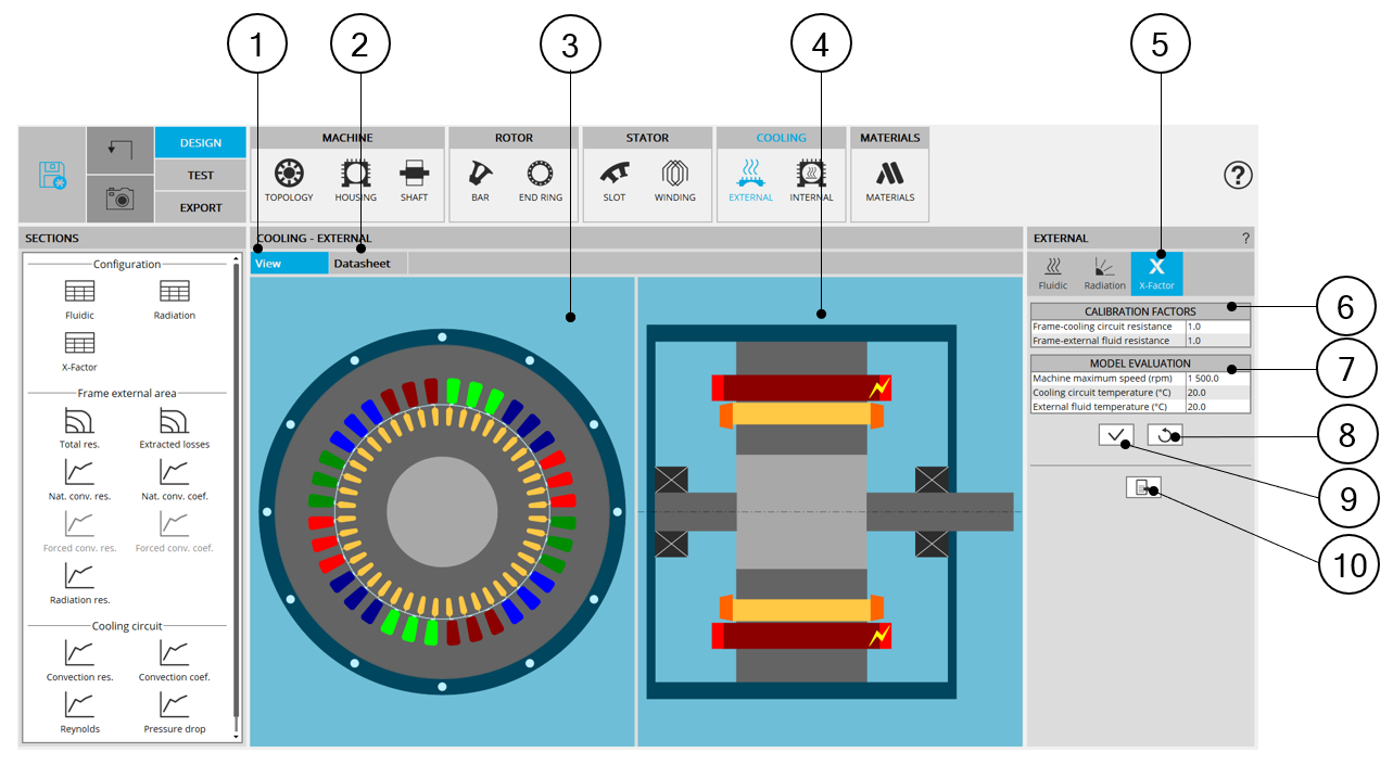 The X-factor panel also contains a set of parameters driving the external cooling (coolant temperatures and rotor speed) allowing the user to evaluate the thermal model embedded.