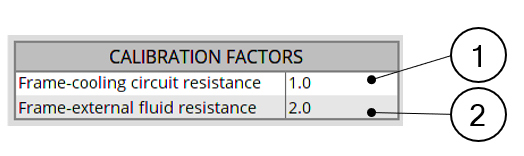 Frame-cooling circuit resistance. This calibration factor is applied on the thermal resistance linking the frame and its cooling circuit. This X-factor exists only when a cooling circuit is defined by the user in the MACHINE subset, HOUSING panel, CIRCUIT setting. |