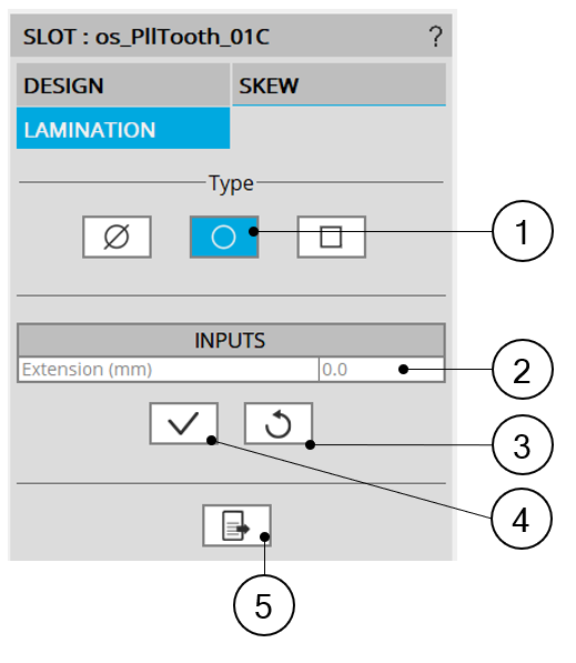 | 2 | Skew tab indicates the tool to define the slot skew angle. |