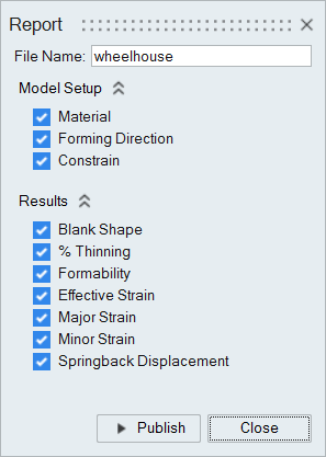 Select the Model Setup and Results information to include in the report. The