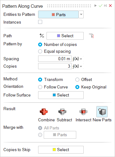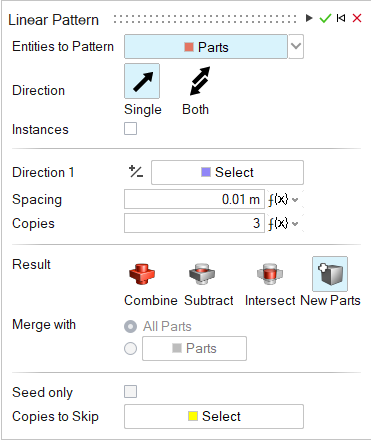- PartsNote: To make all of the parts in the pattern instances of the original part, turn on Instances.