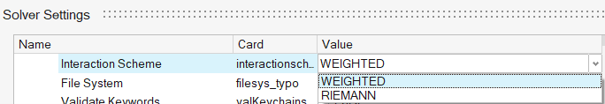 In Solver Settings you can choose whether to use Riemann or Weighted interaction schemes (interactionscheme). Weighted is the default choice and is capable of handling violent and chaotic multiphase flows. Riemann results in smoother pressure gradients and less breakup of sprays and jets but will experience local instabilities with more violent flows.