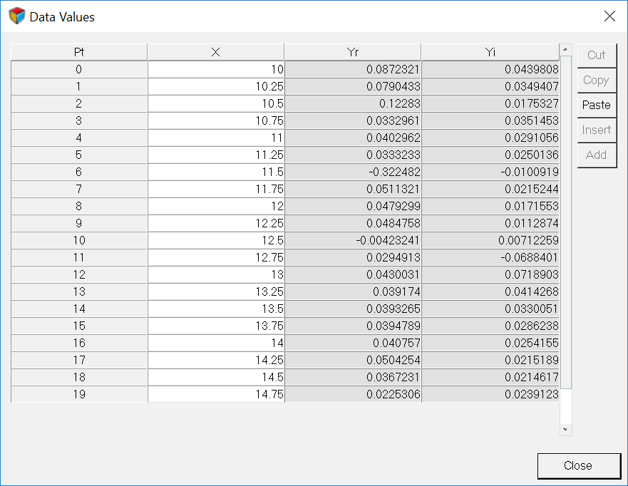 データポイント値は値入力のテーブルに、カット、コピー、ペーストまたは挿入することができます。すべてのX、YおよびY2データポイントを含む大きなダイアログを表示させるには、拡張ボタンをクリックします。
