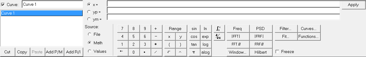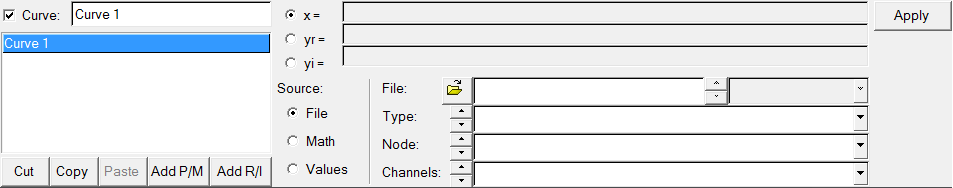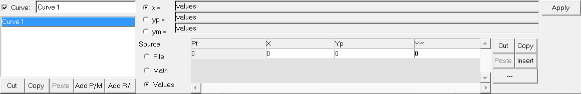 新しいデータは、ソースファイルより選択、プログラムのカーブカリキュレータを使って数学的に定義、あるいは値を入力します。どのソースを選択するかによって、Define Curvesパネルは変化します。