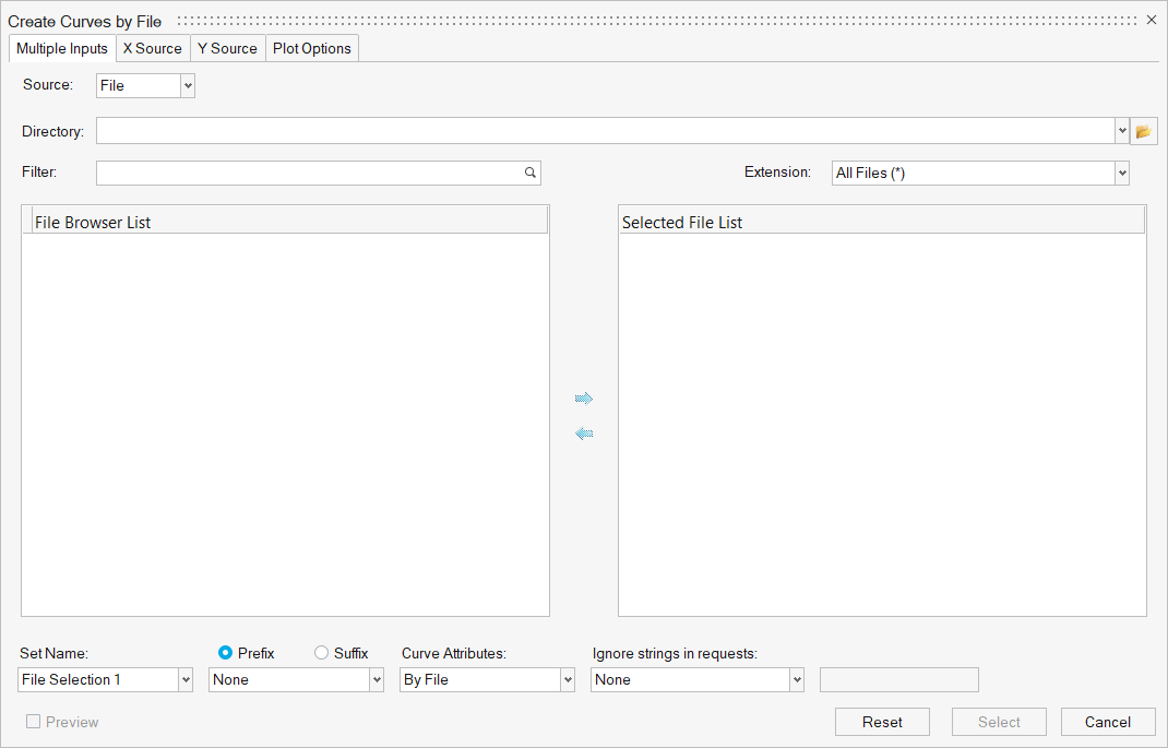 共通したデータを含んだ複数ファイルの選択(例:1つのテストの複数ラン)、または、現在のHyperGraphセッション内におけるすべてのファイルからのデータの同時プロットには、Create Curves by FileダイアログでMultiple Inputsをクリックします。