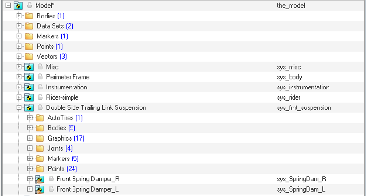 以下の図は、すべてのデータが読み込まれたフロントサスペンションモデルに関するシステムを表示したProjectブラウザです。ダブルサイドトレーリングリンクサスペンションシステムには6つの“子”システムがあります。