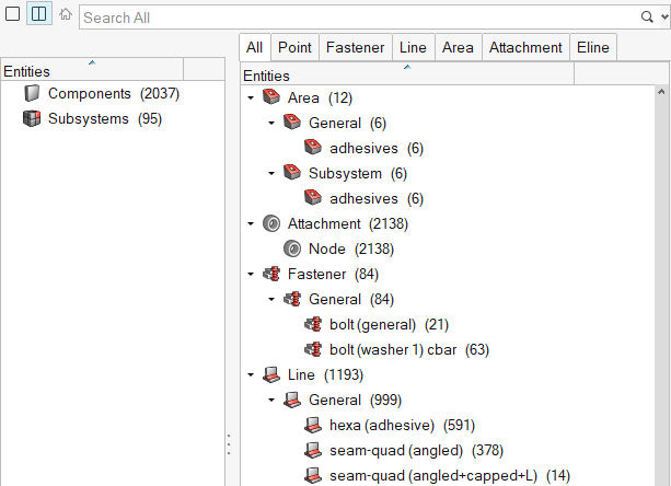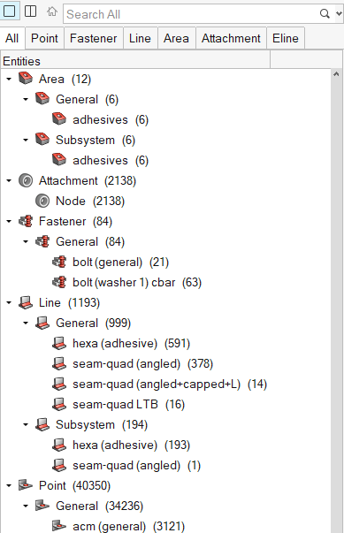 図 1. - All タブ - モデルに含まれるすべてのコネクションリストのツリービューを表示します。HyperMeshは、コネクターをそれぞれのリアライゼーションタイプに基づいて異なるフォルダーにまとめて表示します。フォルダーの名称は、feconfig.cfgファイル内で各ソルバーについて指定されたFEコンフィギュレーション名から取得されます。