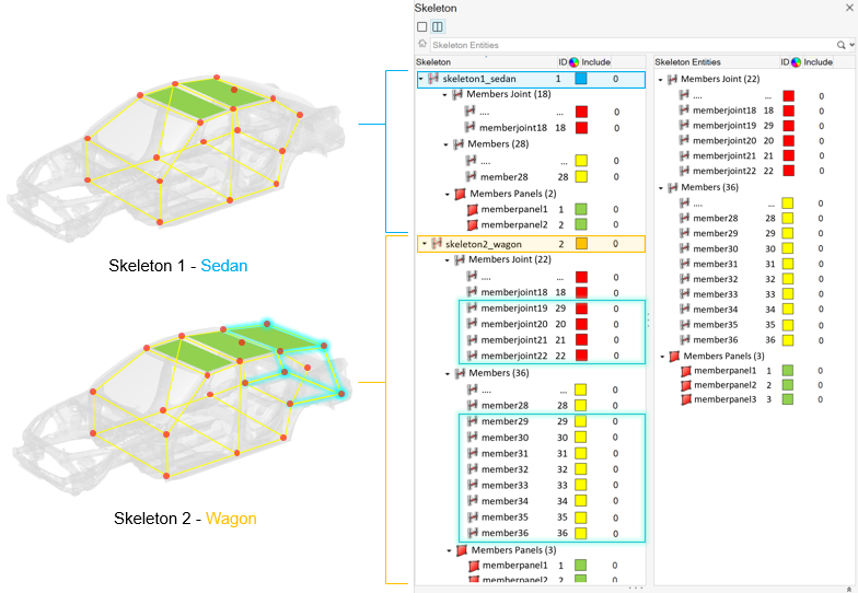 バリアントは、メインペイン(右)からセカンダリペイン(左)にドラッグ&ドロップすることにより作成されます。選択した内容に応じて、適切なエンティティが編成されます。例えば、パネルが新しいスケルトンバリアントに対して編成されると、メンバーとメンバージョイントも編成されます。メンバーの編成により、2つのジョイントも編成されます。
