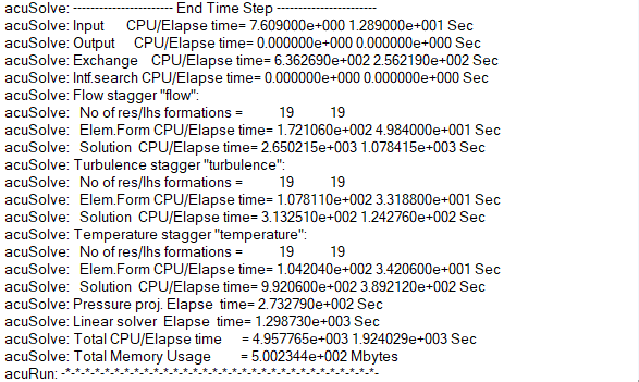 このチュートリアルでは、HyperMesh CFDとAcuSolveを使用して過渡共役熱伝達のシミュレーションを設定し、実行する方法を知ることができました。まず、定常状態の実行用の共役熱伝達設定を含む入力ファイルをインポートしました。定常状態解が計算されたら、過渡シミュレーションパラメータを設定し、入口に過渡条件を適用しました。過渡解の計算後、HyperViewを使用して結果をポスト処理しました。