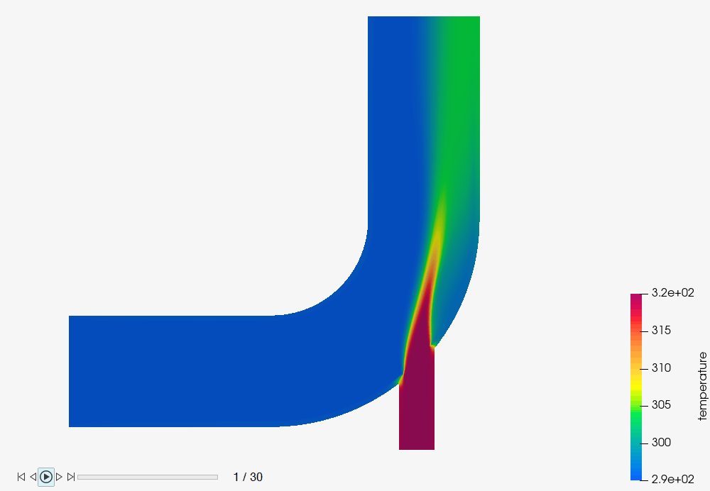 このチュートリアルでは、HyperMesh CFDとAcuSolveを使用してミキシングエルボで共役熱伝達を伴って発生する3次元乱流を取り上げ、その過渡シミュレーションを実行する方法について説明します。ここでは、ACU-T:3100 ミキシングエルボにおける共役熱伝達のチュートリアルを実施済みで、HyperMesh CFDおよびAcuSolveの基本を理解しているものとします。入門チュートリアルであるACU-T:1000 ユーザーインターフェースでは、AcuSolveとHyperViewの基本的な機能を紹介しています。
