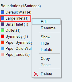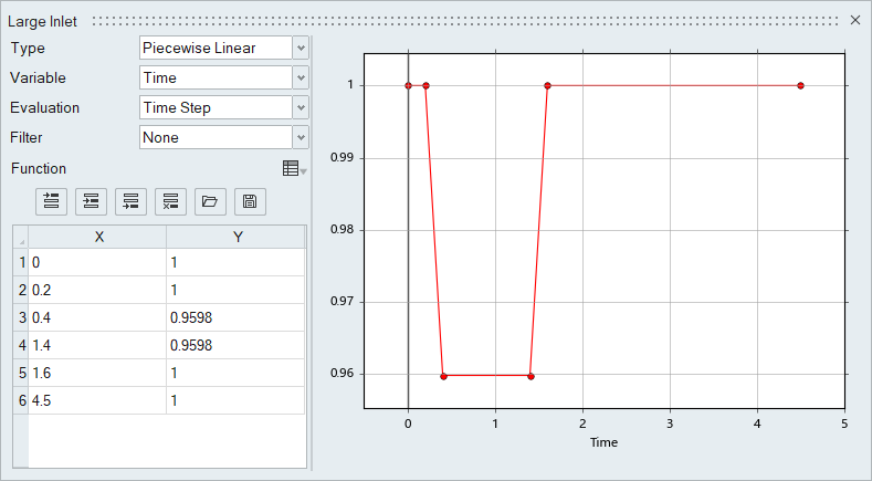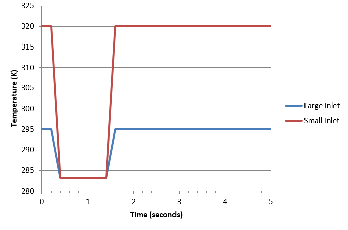 大きい入口では、温度が295Kから283.15Kに変化し、小さい入口では320Kから283.15Kに変化します。大きい入口で、初期温度に対してコールドスラグの温度が示す比率は0.9598です。小さい入口の流れの初期温度に対するコールドスラッグの温度の比率は0.8848です。これらの値は、入口での過渡温度をモデル化するMultiplier Functionの作成時に使用されます。
