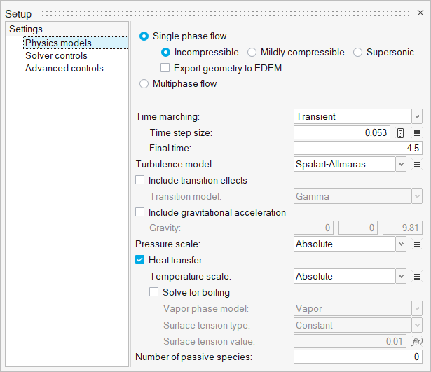シミュレーション開始後0.2秒で、両方の入口から水のコールドスラグが注入され、0.2秒から0.4秒の間に、流入口での温度が283.15Kに低下します。この温度は、そこから1秒間は283.15Kに維持されますが、1.4秒から1.6秒の間に初期状態まで上昇します。流路長を0.6356mとすると、スラグの通過時間は約1.6秒になります。したがって、スラグの期間と通過時間を考慮したシミュレーションとするには、その時間を3.2秒以上とする必要があります。熱条件が定常状態に復帰するまでに要する時間を見込むと、シミュレーションの合計時間は4.5秒になります。