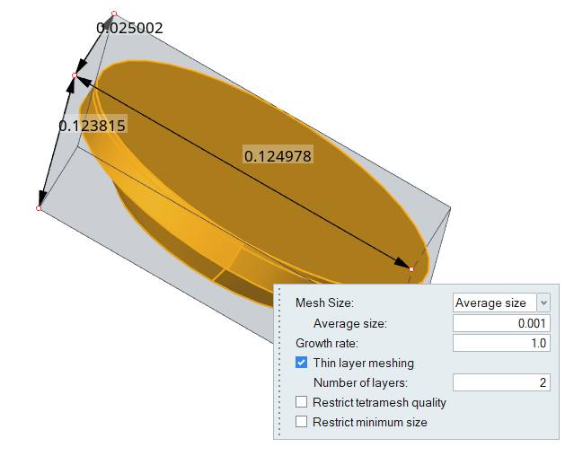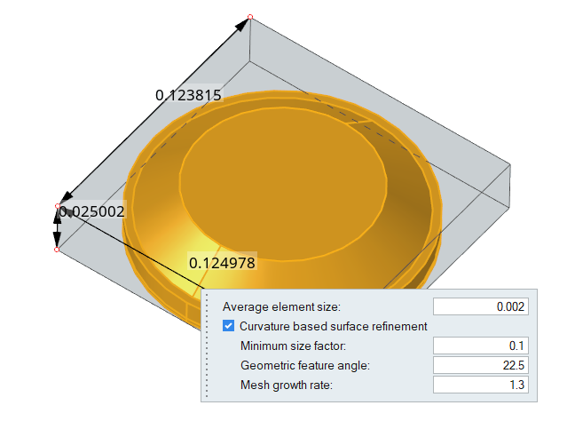 ハウジングおよびレンズのソリッドは厚みが小さいため、ボリュームメッシュが生成されたときにこれらのソリッドの厚み方向に2つの層ができるように、薄層メッシングツールを使用します。