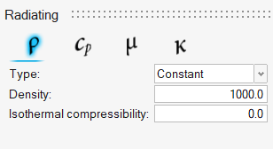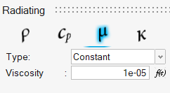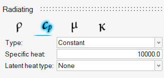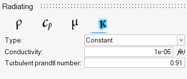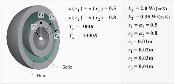 この問題では、次の図に示すように、一定の温度に保持されたサーフェスを持つ2つの同心球体の間に、任意の材料特性を持つ流体の領域があります。なお、この図の比率は、ここに示した数字のとおりにはなっていません。外側球体の半径は0.04m、内側球体の半径は0.01mです。内側球体の内側サーフェスでは、300.0K(26.85°C)の一定壁面温度が保持されているものとします。また、外側球体の外側サーフェスでは、1300.0K(1026.85°C)の一定壁面温度が保持されているものとします。外側球体内部の流体は、放射のみで熱が伝達される非伝導材料であるとします。