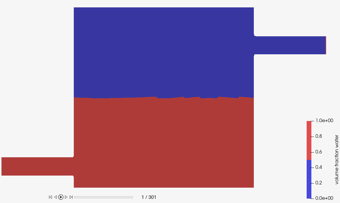 ここで解析する問題を以下の図に示します。図1は、時間t=0の時点で半分まで満たされた水タンクの概略図です。t=0で入口からの注水を開始し、その注水の進捗に伴う水と空気との界面の変化を、過渡シミュレーションで可視化できます。