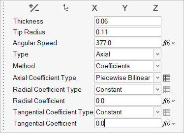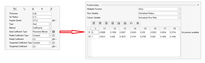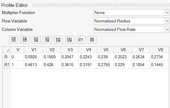 最初の列(0,1)は正規化された半径で、最初の行(0.0926,…,0.2734)が正規化された流速を定義します。2番目の行データ(0.4613,…,0.1445)は、軸係数です。