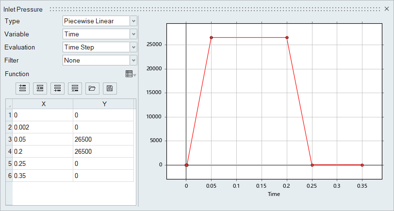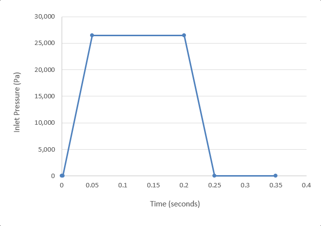 シミュレーションの開始時には、流れ場は静止しています。流れは、図 2に示す区分線形関数として経時変化する入口圧力によって引き起こされます。入口圧力が上昇するにつれて、バルブが開くため流れは加速されます。乱流粘性率は10と想定されています。