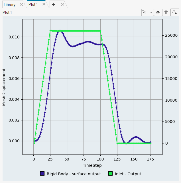 このケースでは、対象となるこの過渡挙動は、過渡圧力プロファイルによって与えられている、圧力が上昇してから再び低下するのにかかる時間内に生じます。スプリングが元の状態に戻るための時間を見越して、追加の時間がシミュレートされます。このチュートリアルでは、圧力が降下して初期状態に戻った後に0.1秒が追加されるため、合計時間は0.35秒となります。