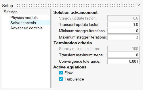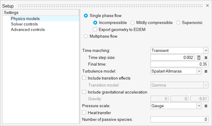 流れの初期状態は実際には層流ですが、バルブシャッター周囲の流量と流速の増大によって、乱流状態への急速な変化が生じると予想されます。したがって、このシミュレーションは、過渡的な乱流をモデル化するように設定されます。非定常解析を実行する際は、定義済みのスタッガー基準に基づいて時間ステップごとに収束に達します。メッシュモーションは、任意のメッシュ移動(ALEメッシュモーション)を使用してモデル化されます。