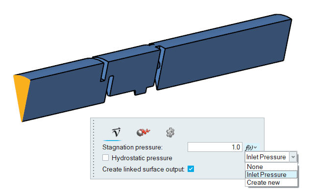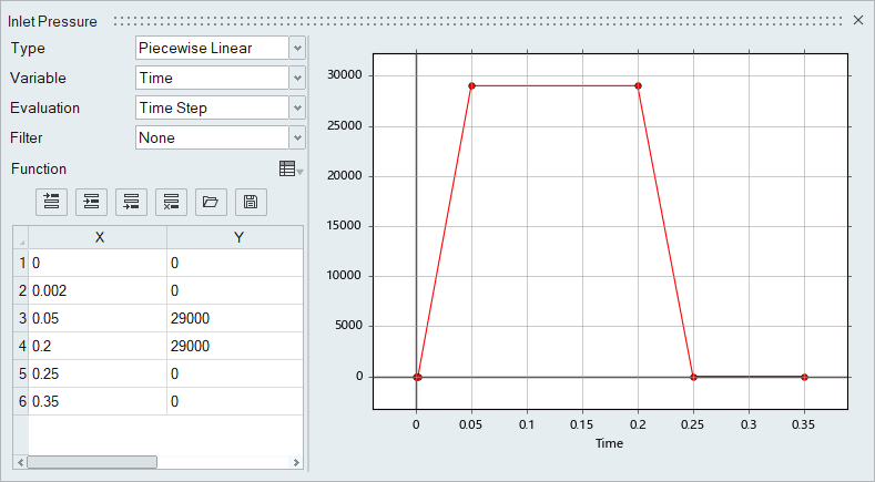 シミュレーションの開始時には、流れ場は静止しています。流れは、図 2に示す区分線形関数として経時変化する入口圧力によって引き起こされます。入口圧力が上昇するにつれて、バルブが開くため流れは加速されます。乱流粘性率は10と想定されています。