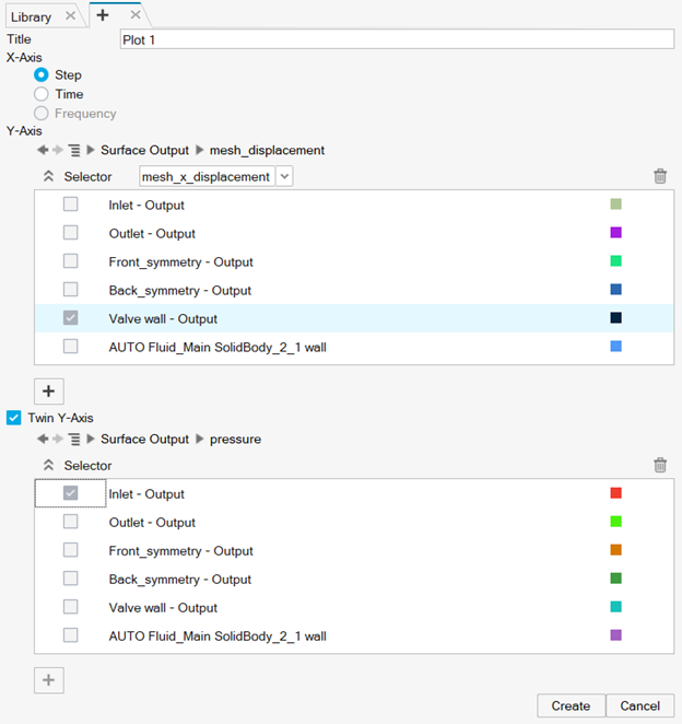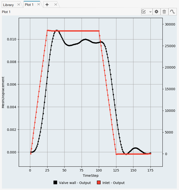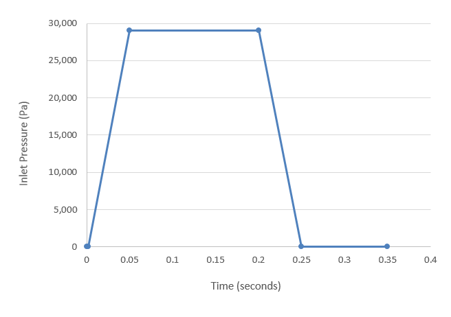 このケースでは、対象となるこの過渡挙動は、過渡圧力プロファイルによって与えられている、圧力が上昇してから再び低下するのにかかる時間内に生じます。スプリングが元の状態に戻るための時間を見越して、追加の時間がシミュレートされます。このチュートリアルでは、圧力が降下して初期状態に戻った後に0.1秒が追加されるため、合計時間は0.35秒となります。