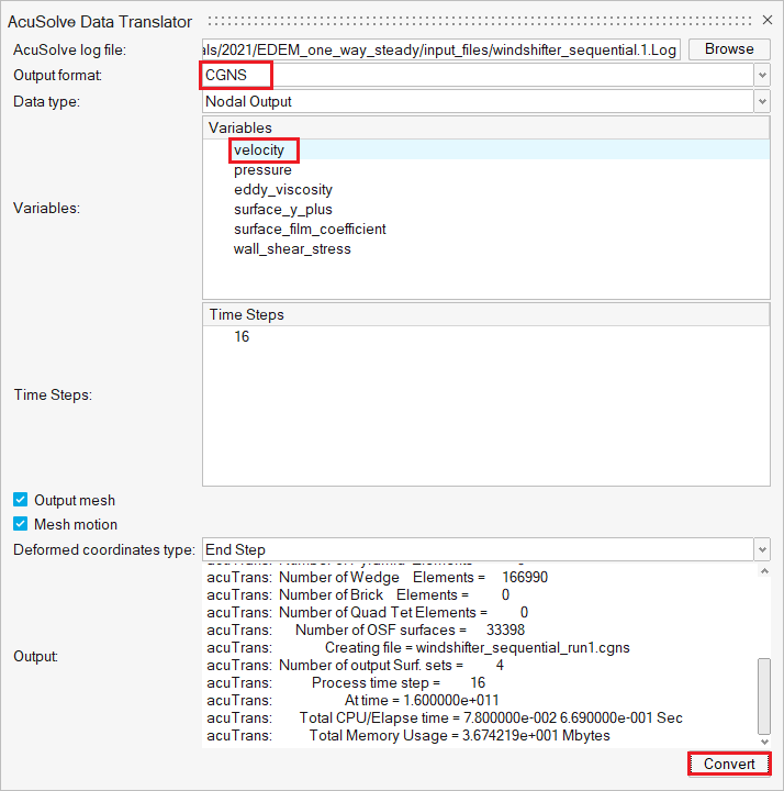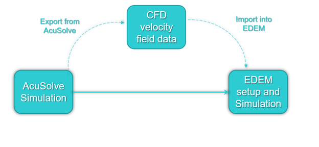 AcuSolveシミュレーションの設定にはHyperMesh CFDを使用します。AcuSolveシミュレーションが完了したら、AcuSolveで提供されるAcuTransユーティリティを使用して、速度節点データがCGNS形式でエクスポートされます。このフィールドデータがEDEMにインポートされ、流体による粒子の抗力の計算に使用されます。