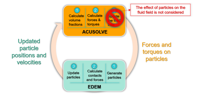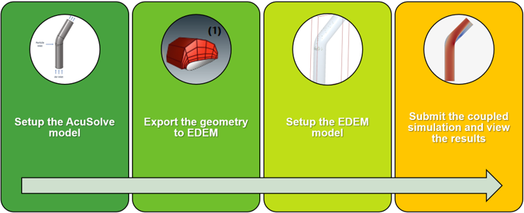 AcuSolveモデルはHyperMesh CFDを使用して設定します。AcuSolveの設定が完了したら、EDEMのデック(形状を含む)がHyperMesh CFDからエクスポートされます。この入力デックはEDEMで開かれ、EDEMの設定を実行するために使用されます。EDEMデックの設定の終了後、連成シミュレーションを起動します。