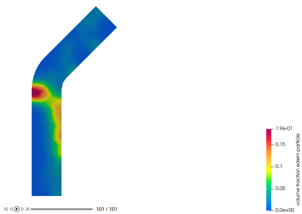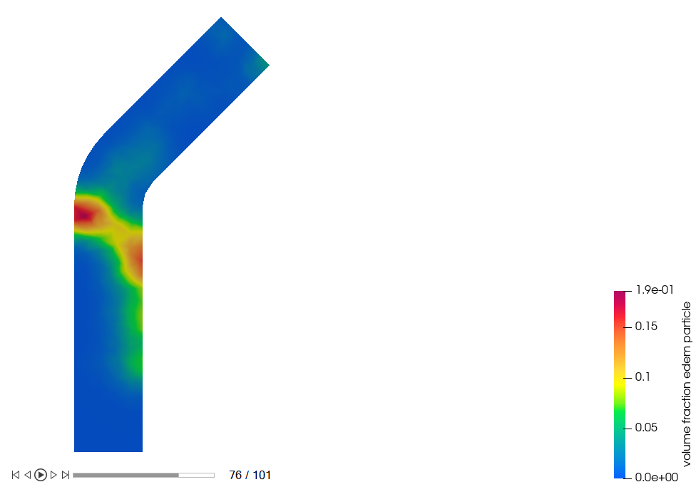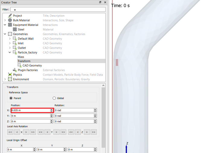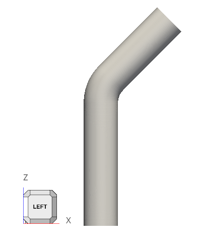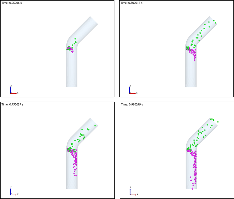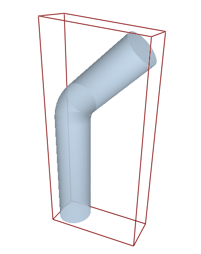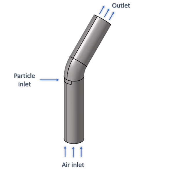 このモデルは45度に曲がった円筒管で構成されます。管の半径は0.25mで、粒子の入口は管全体の長さの中ほどに配置されます。