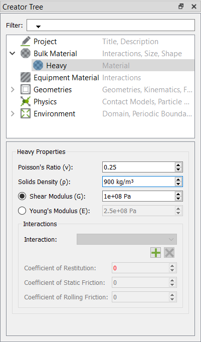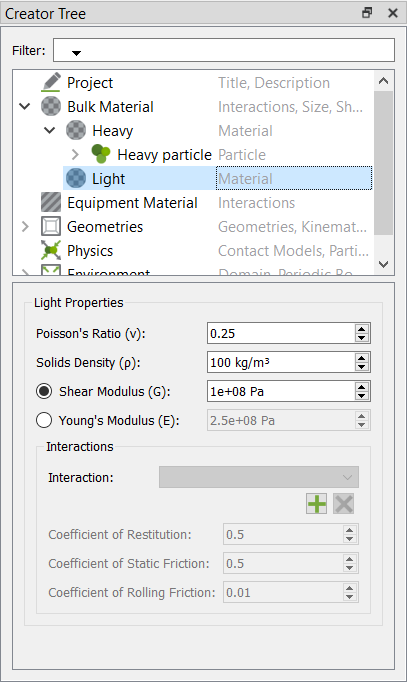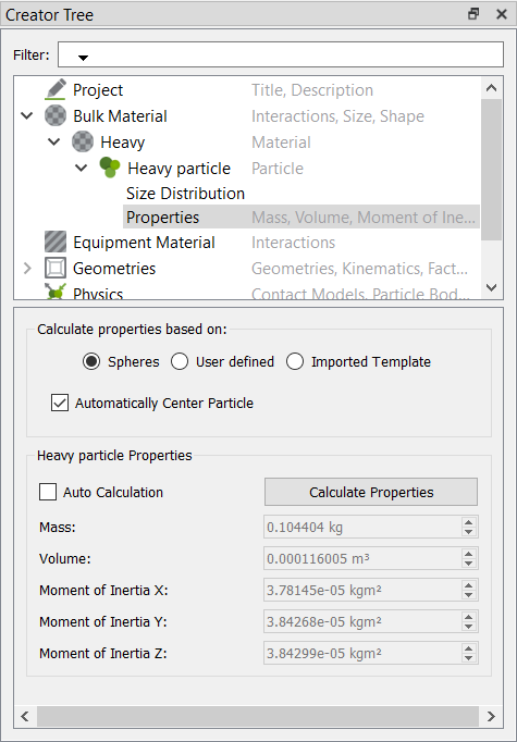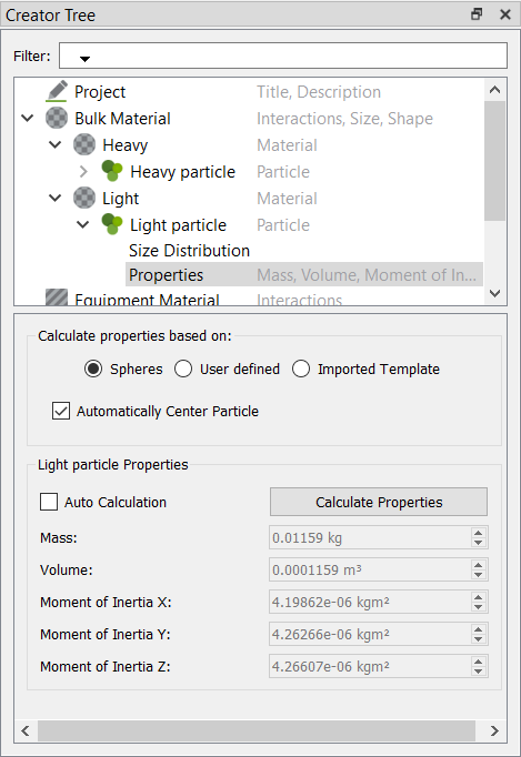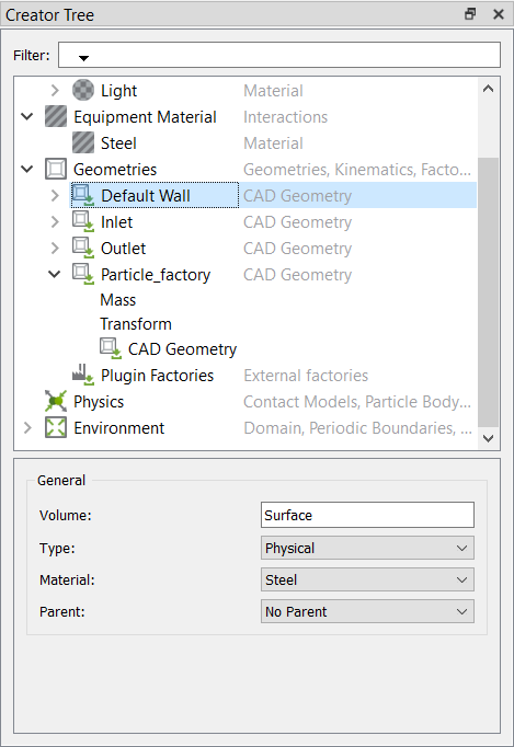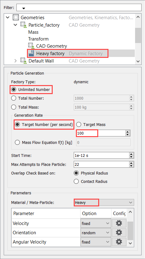 これでBulk Materials 、形状セクション、Equipment Materialが定義されたので、次は粒子を生成するためParticle Factoryを作成する必要があります。Bulk Materials ごとに1つのファクトリを作成します。
