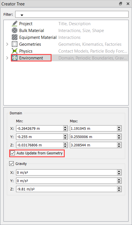この手順では、EDEMのシミュレーション領域の範囲と重力加速度の方向を定義します。