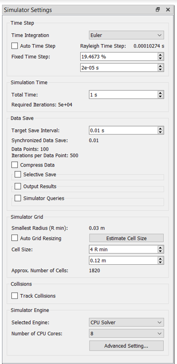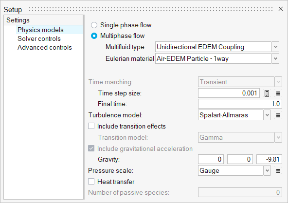 前述したとおり、AcuSolveシミュレーションの起動時に、HyperMesh CFDが一連のEDEMファイルを作業ディレクトリ内に作成しました。このEDEMの入力デックを開き、DEMシミュレーションを設定します。