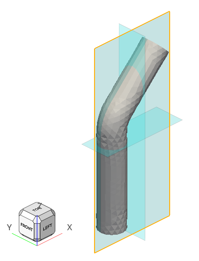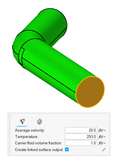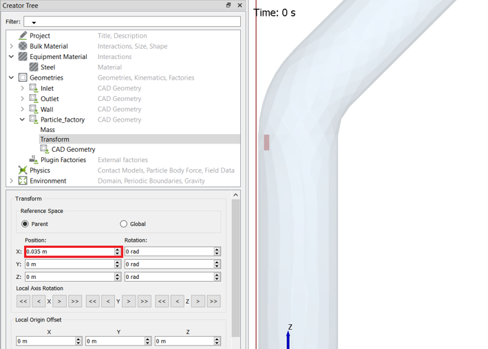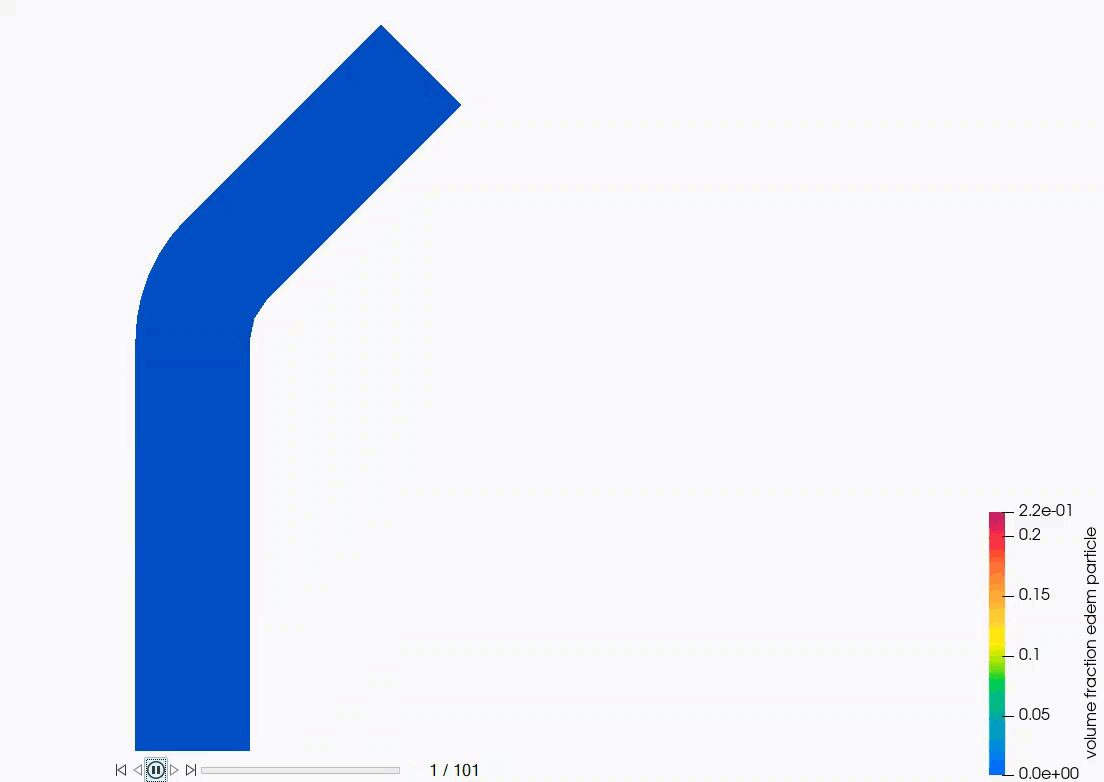 このモデルは45度に曲がった円筒管で構成されます。管の半径は0.25mで、粒子の入口は管全体の長さの中ほどに配置されます。